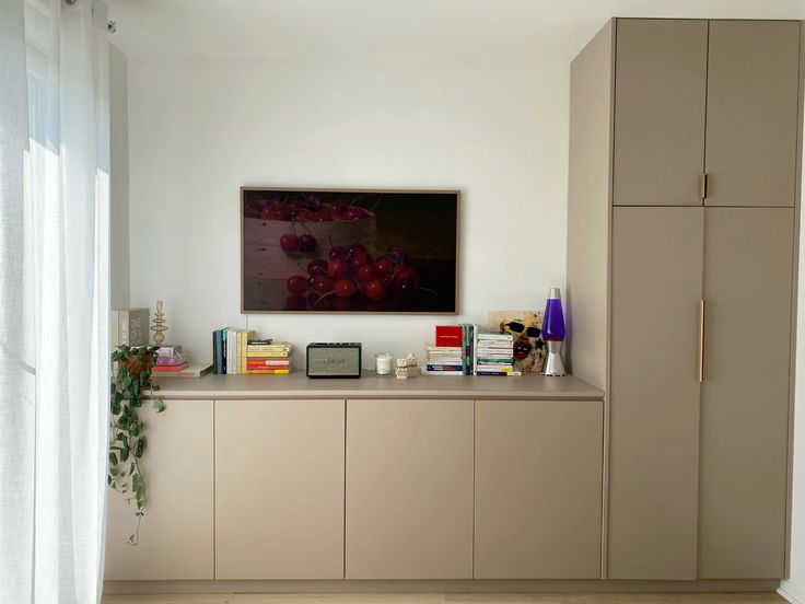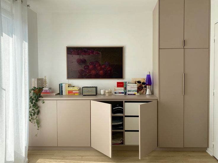 À travers ce projet d’aménagement intérieur, découvrez notre dernière création sur mesure : concilier l’esthétique avec le pratique. L’espace de vie d’un studio étant limité, notre cliente souhaitait jouer et aménager la pièce centrale du studio : à la fois commode, meuble TV, bureau caché, armoire et penderie, ce meuble regorge de fonctionnalités, tout en gardant une harmonie et le plaisir de découvrir cette pièce tous les jours.